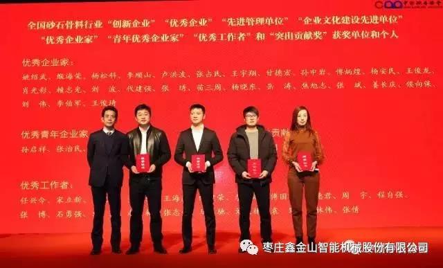 在中國(guó)砂石協(xié)會(huì)2017年年會(huì)中,棗莊鑫金山智能機(jī)械股份有限公司包攬了大會(huì)頒發(fā)的全部獎(jiǎng)項(xiàng),獲得了“砂石骨料行業(yè)2017年度優(yōu)秀企業(yè)”、“砂石骨料行業(yè)2017年度創(chuàng)新企業(yè)”;與此同時(shí),公司孫中巖董事長(zhǎng)獲得“砂石骨料行業(yè)2017年度優(yōu)秀企業(yè)家”、營(yíng)銷副總孫啟祥獲得“砂石骨料行業(yè)2017年度優(yōu)秀青年企業(yè)家”技術(shù)部長(zhǎng)馬馳獲得“砂石骨料行業(yè)2017年度優(yōu)秀工作者”的榮譽(yù)稱號(hào)。同時(shí),在第二屆全國(guó)砂石骨料大賽三等獎(jiǎng)、第六屆攝影作品大賽中榮獲三等獎(jiǎng)。