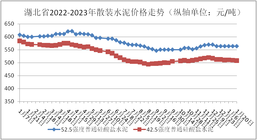 監(jiān)測(cè)數(shù)據(jù)顯示:1月份,42.5強(qiáng)度普通硅酸鹽水泥、42.5強(qiáng)度礦渣硅酸鹽水泥、52.5強(qiáng)度普通硅酸鹽水泥全省平均價(jià)格分別為:509.44元/噸、498.43元/噸、564.00元/噸,環(huán)比分別下跌:0.97%、0.67%、0.42%;同比分別下跌:11.68%、11.57%、6.47%。具體價(jià)格走勢(shì)情況如下圖: