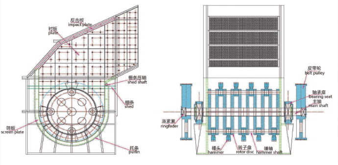 結(jié)構(gòu)分析:270度篩板和錘頭錯(cuò)位布置,減少石粉產(chǎn)生。耐磨護(hù)套,降低部件磨損。雙皮帶輪,降低電機(jī)使用率。