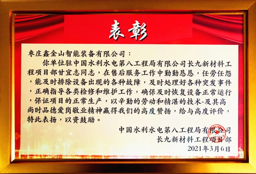 2021年春節(jié)期間,為了保證長九公司(神山項目)假期正常生產,鑫金山客服中心決議就地過年。甘宜志經理連續(xù)駐扎項目三個月不休息,在售后服務工作中勤勤懇懇,任勞任怨,及時處理突發(fā)事件,積極指導各類檢修和維護工作,確保及時恢復設備正常運行,保證項目的正常生產。甘宜志經理以辛勤的勞動和精湛的技術及其高尚的愛崗敬業(yè)精神贏得了該項目業(yè)主的高度贊揚與評價,并贈予表彰信特此表揚。為雙方公司的再次合作奠定了良好的基礎。