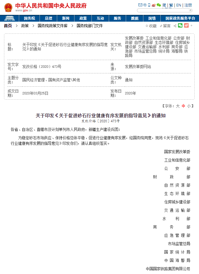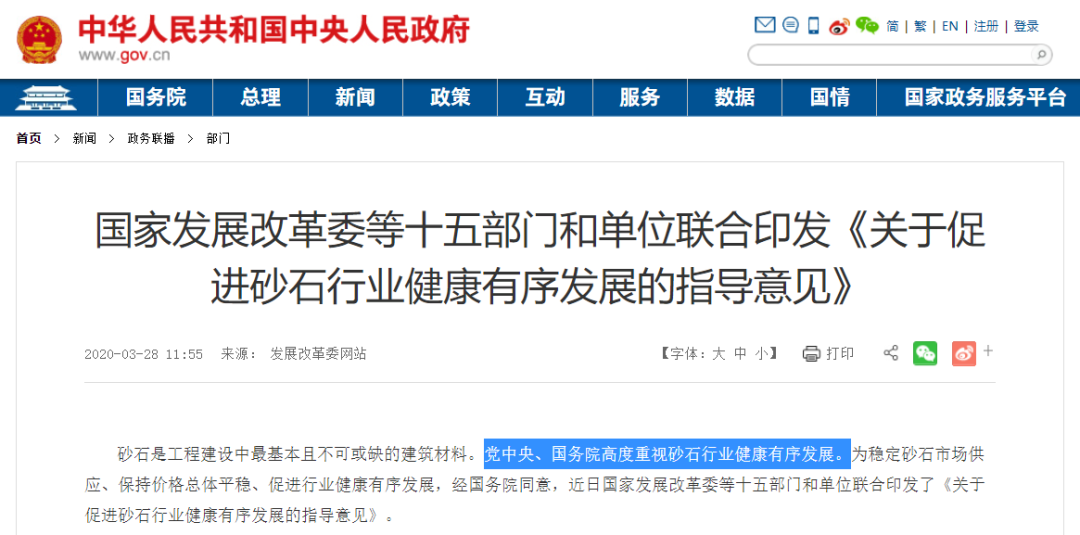 中國(guó)政府網(wǎng)第一時(shí)間對(duì)十五部門和單位聯(lián)合印發(fā)的《關(guān)于促進(jìn)砂石行業(yè)健康有序發(fā)展的指導(dǎo)意見》進(jìn)行全文發(fā)布: