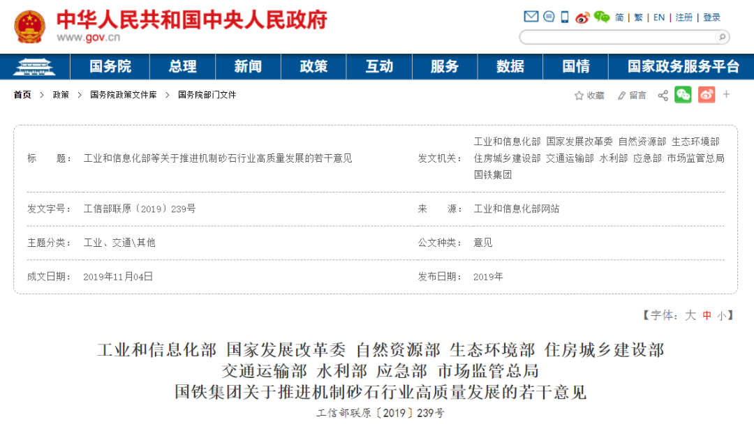中國(guó)政府網(wǎng)第一時(shí)間對(duì)工業(yè)和信息化部與guojia發(fā)展改革委、自然資源部、生態(tài)環(huán)境部等十部門聯(lián)合發(fā)布的《關(guān)于推進(jìn)機(jī)制砂石行業(yè)高質(zhì)量發(fā)展的若干意見》進(jìn)行全文報(bào)道: